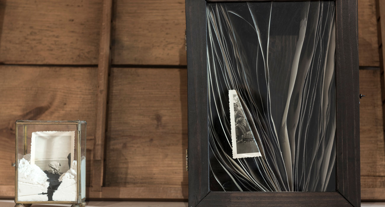 The theme of the personal archive also connects to the artist’s passion for collecting and gathering old photographs, albums, postcards, porcelain, stones, and various bizarre objects and pieces of furniture—objets trouvés that she subsequently manipulates and transforms. These become her working material and tools, underscored by the layering and repetition of her characteristic motifs and symbols: streaks of black ink, diluted pools of color, drifting particles of dust and smoke, blurred horizons, ribbons, or flowers as potent symbols of femininity, nostalgia, and sentiment. The woman becomes the central motif in the re-narration of black-and-white photographs. This time, Tallová also focuses on photographic flaws—blurred or distorted images, poor compositions, mistakes and accidents occurring during development, as well as the effects of time and the patina of photographic paper—elements she actively seeks out, conceals, and transforms through painting and collage.